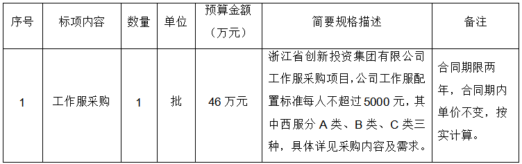 浙江省成套招標(biāo)代理有限公司受浙江省創(chuàng)新投資集團(tuán)有限公司委托,現(xiàn)就工作服采購項(xiàng)目進(jìn)行競(jìng)爭(zhēng)性磋商,歡迎國內(nèi)合格的供應(yīng)商前來磋商。